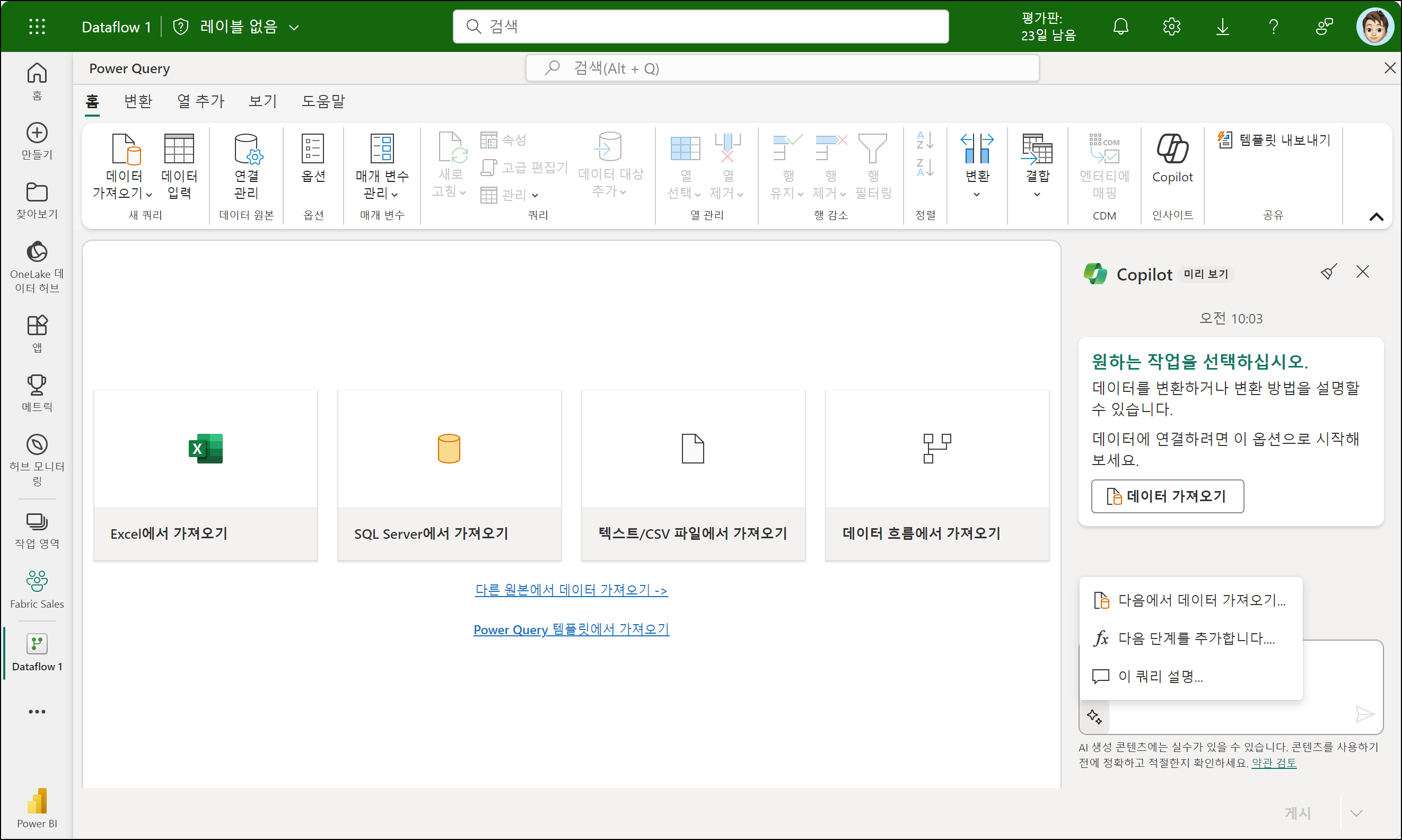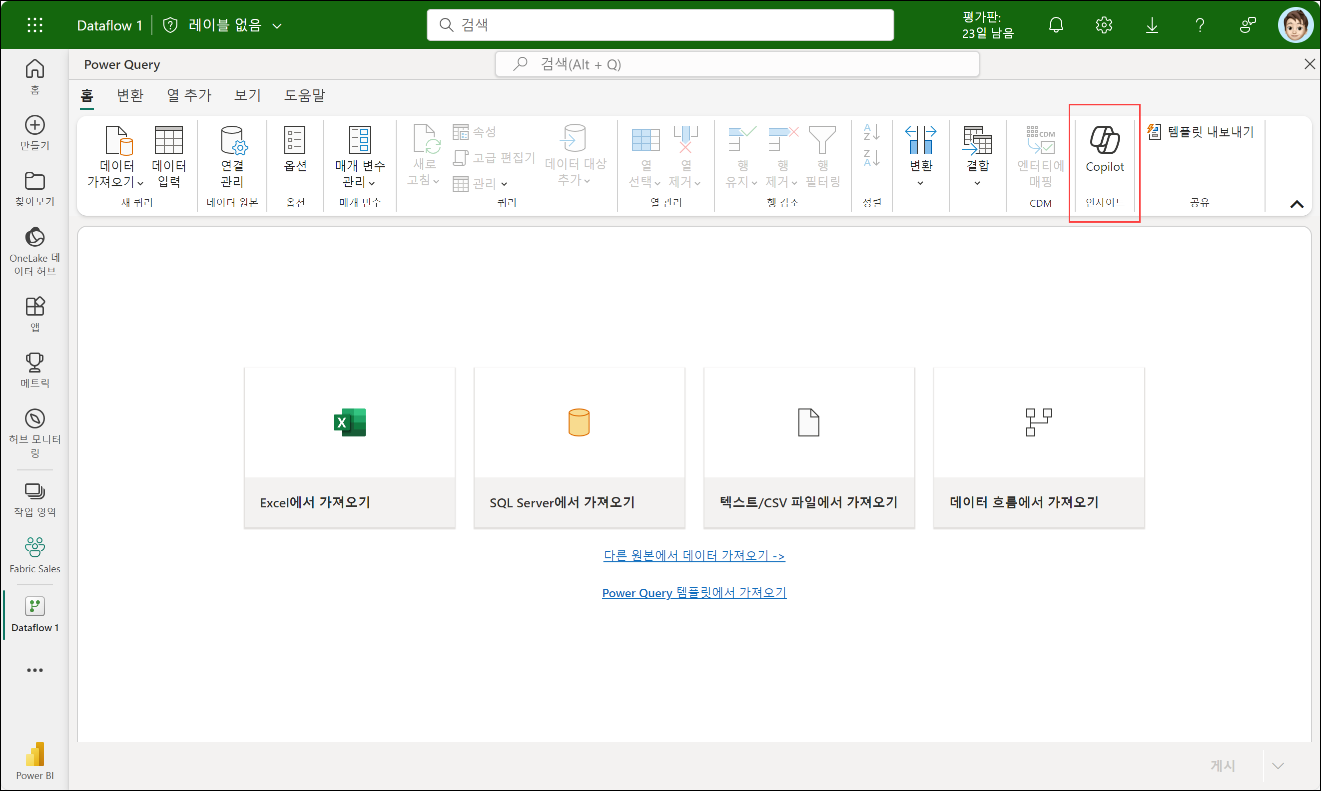 작업 영역은 Copilot이 활성화되어 있어야 합니다. 데이터 흐름 2세대(Dataflow Gen2)를 새로 만들기하여 상단 리본 메뉴를 확인해보면 Copilot을 확인할 수 있습니다.