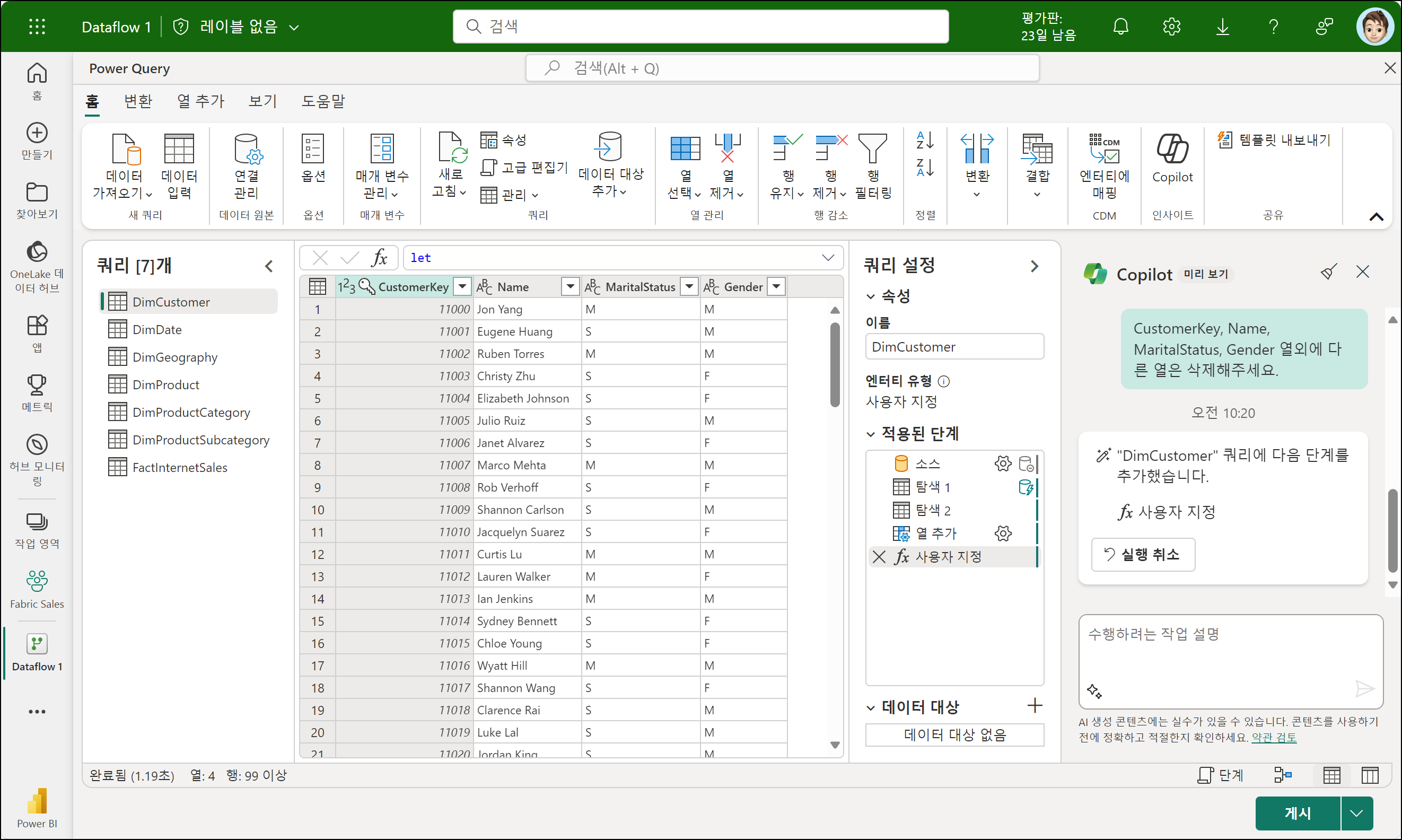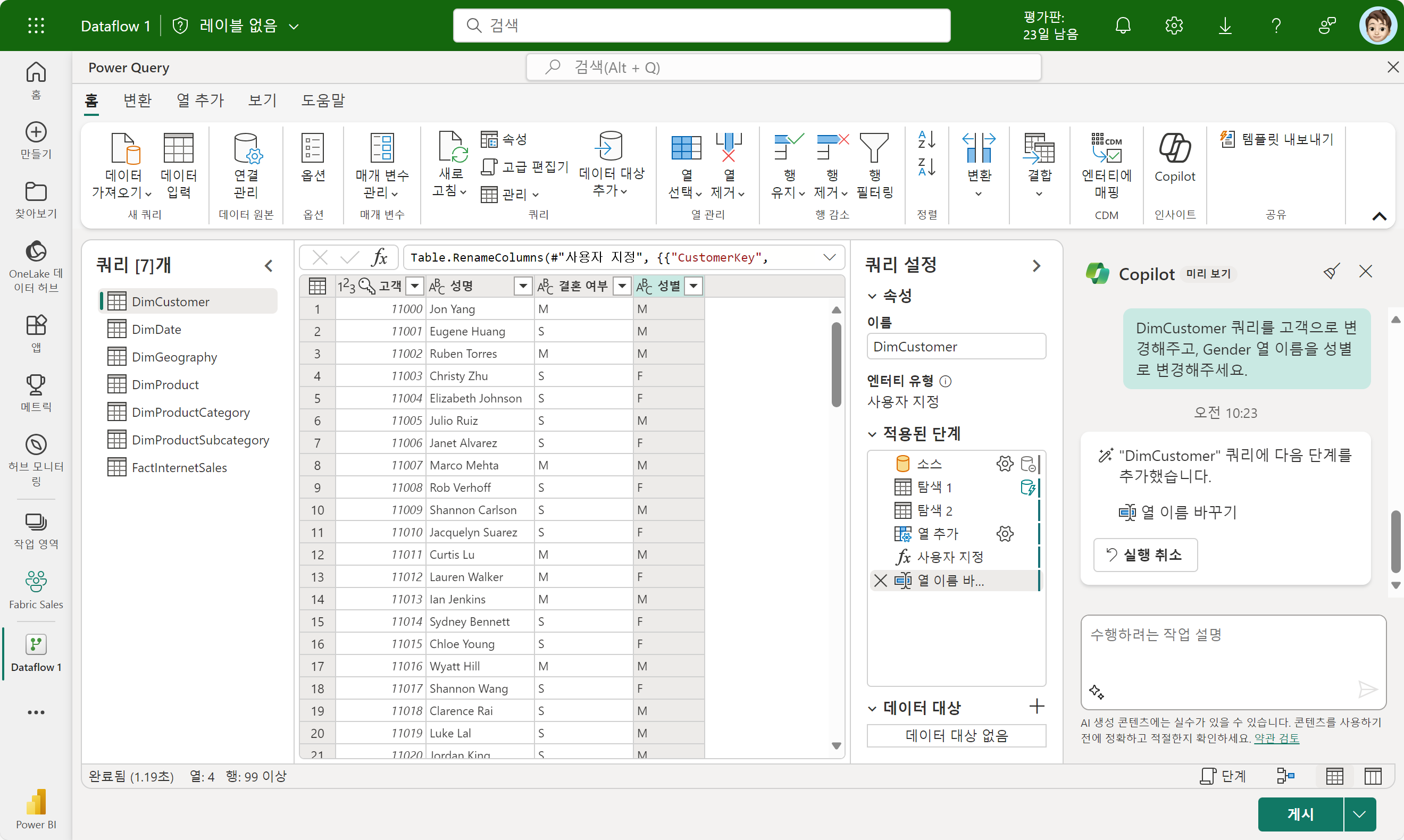 DimCustomer 쿼리를 고객으로 변경해주고, Gender 열 이름을 성별로 변경해주세요.