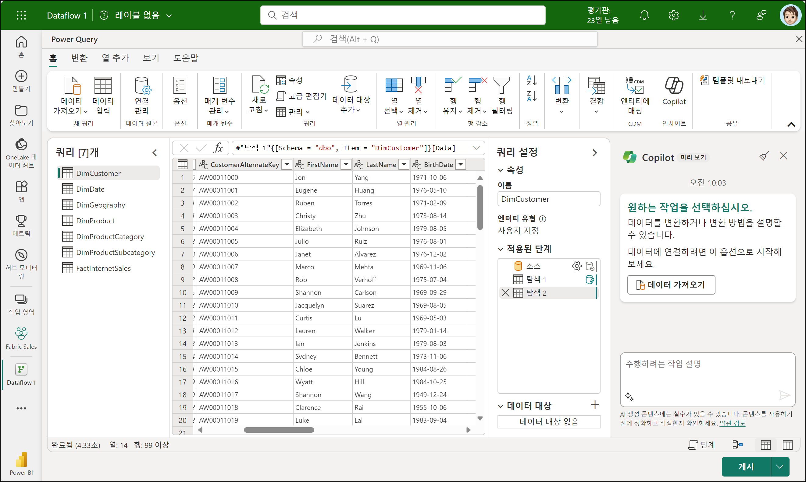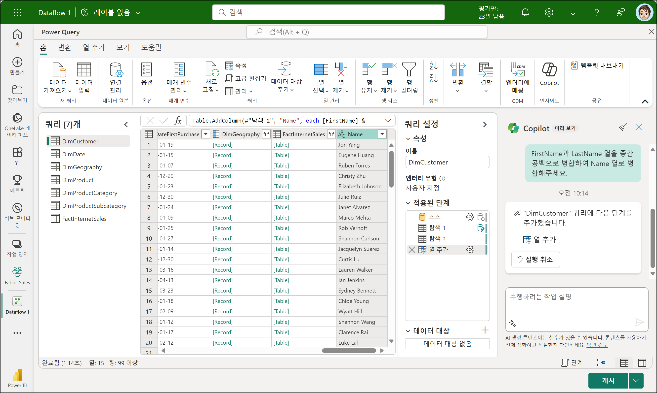 데이터 가져오면, 프롬프트 창에서 자연어로 열 추가, 변환 작업 등을 수행할 수 있습니다. Customers 테이블에서 FirstName과 LastName 열을 중간 공백으로 병합하여 Name 열로 병합해보겠습니다. DimCustomer 쿼리를 선택하고 DimCustomer 테이블에 해당하는 프롬프트를 제출해야 합니다.
