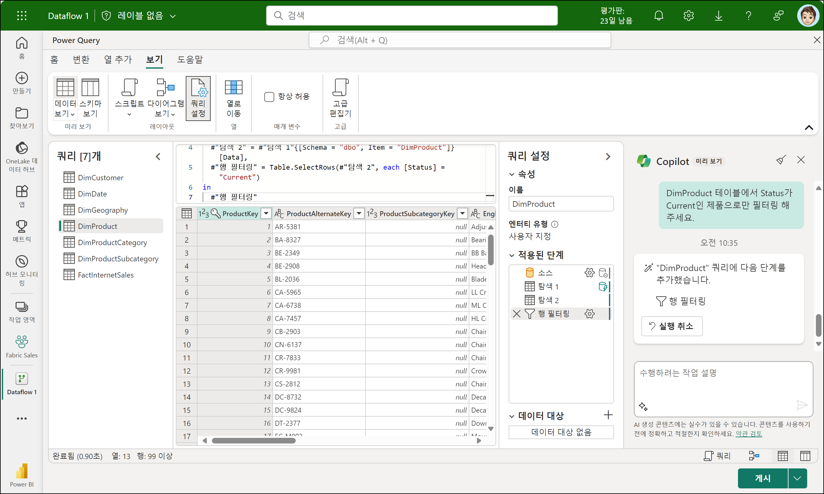 DimProduct의 데이터를 필터링해보겠습니다. 행 필터링이 잘 적용된 것을 스크립트에서 확인 가능합니다.