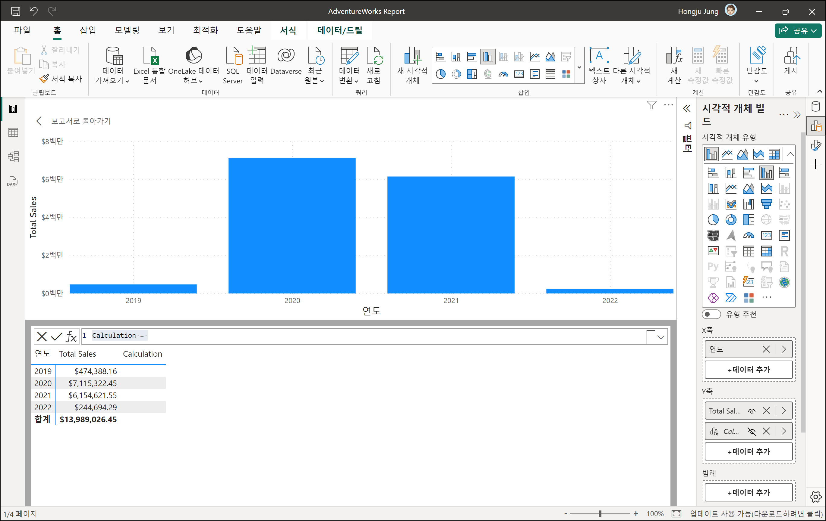 시각적 개체를 간략히 확인해보았습니다. 시각적 개체의 데이터를 기반으로 Excel 함수식과 유사하게 계산식을 적용할 수 있어 효과적이라 생각됩니다. 시각적 개체에만 반영되므로 여러 시각적 개체에서 사용하려면 DAX를 사용해야 합니다.