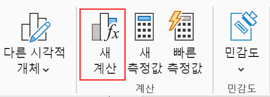 시각적 계산은 [홈] 탭의 계산 그룹의 [새 계산] 메뉴를 통해 이용할 수 있습니다. 시각적 개체를 선택한 상태에서 [새 계산] 메뉴가 활성화됩니다.
