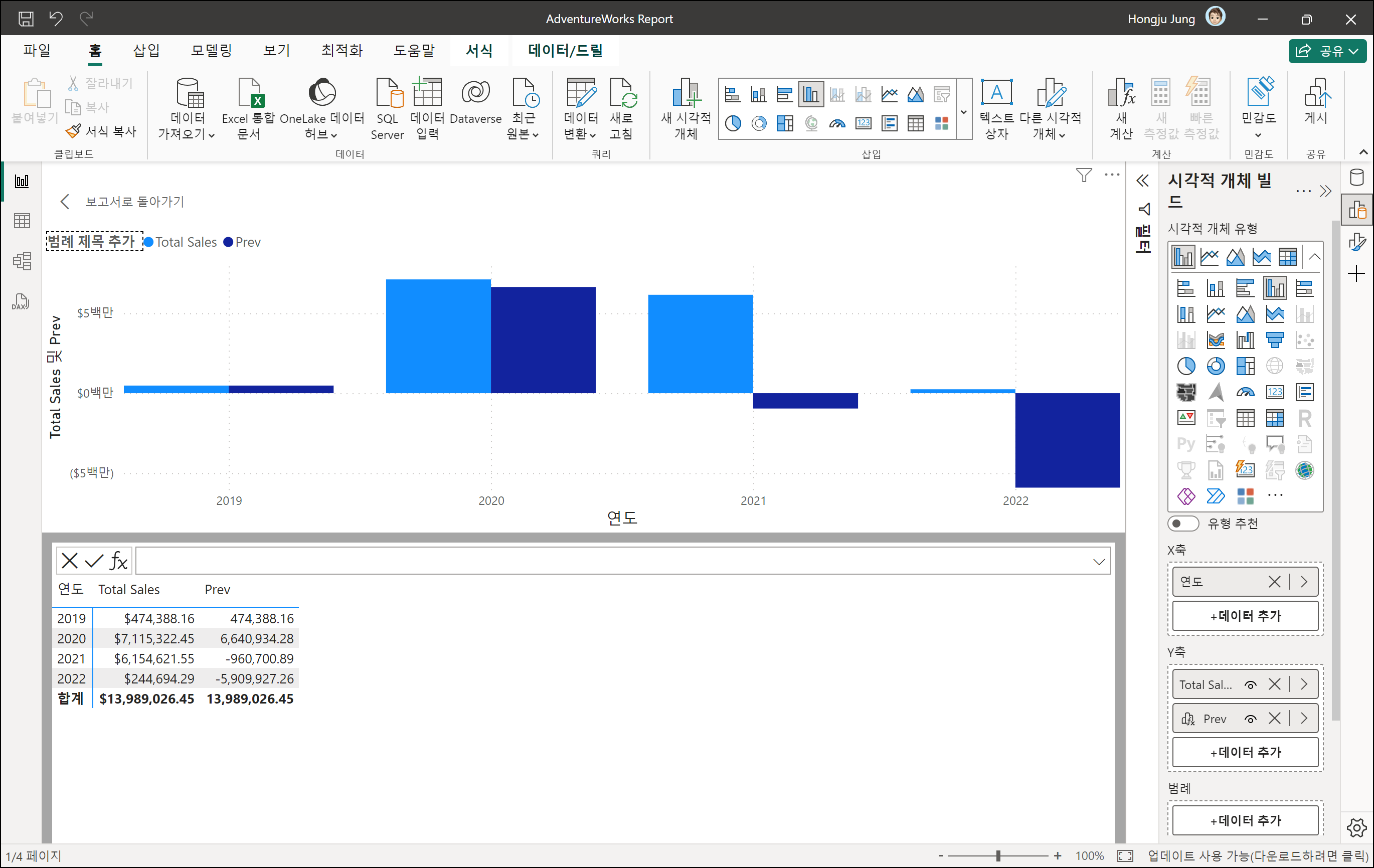 현재 시각적 개체의 데이터를 기반으로 이전 Total Sales 와 비교를 해줍니다. 연도별 총매출을 표시해주고 있으므로, 전년 비교 매출 차이를 보여줍니다. 전년 비교 DAX에서는 날짜 함수를 사용하여 값을 구해야 하고, 비즈니스 사용자에게는 조금 직관적이지는 않습니다.