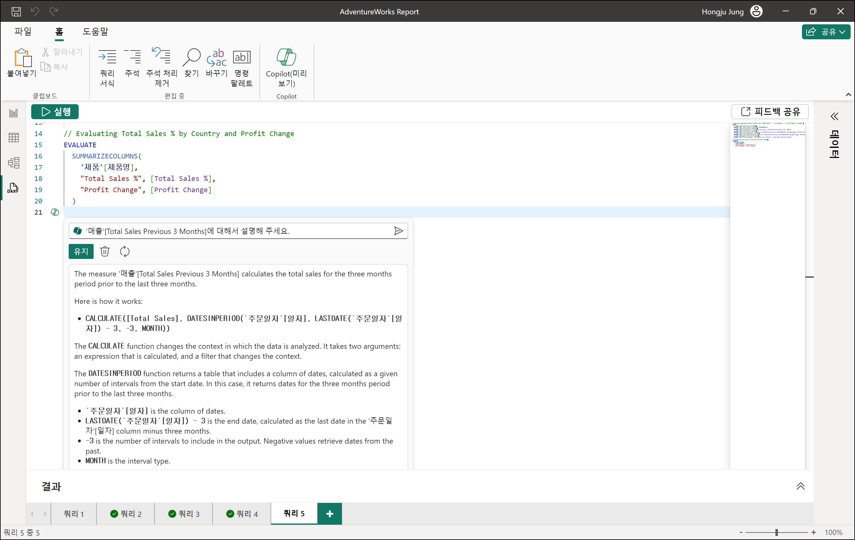 DAX 쿼리 보기에서 작성한 쿼리에 대한 설명을 확인할 수 있습니다. 위에서 실행한 유사한 쿼리 구문 아래에 “이 쿼리가 수행하는 작업을 설명해 주세요.”라고 질문을 하면 쿼리에 대한 함수별 설명을 제공합니다(현재는 영문 설명입니다)
