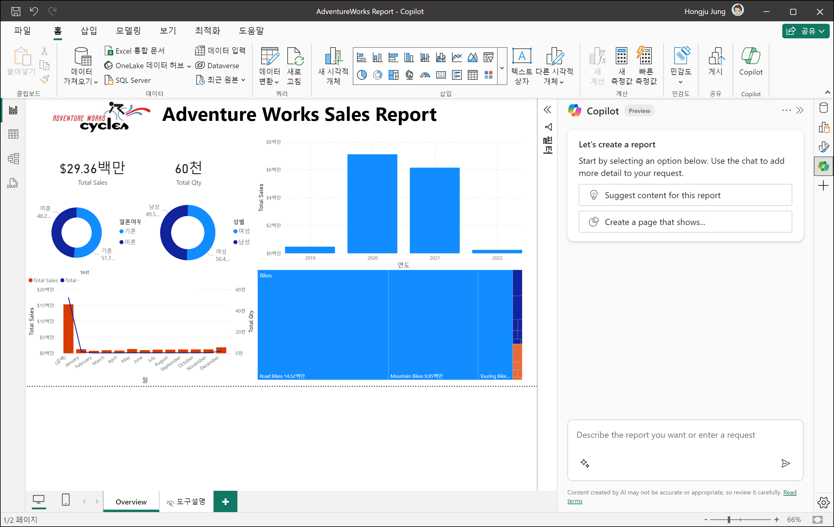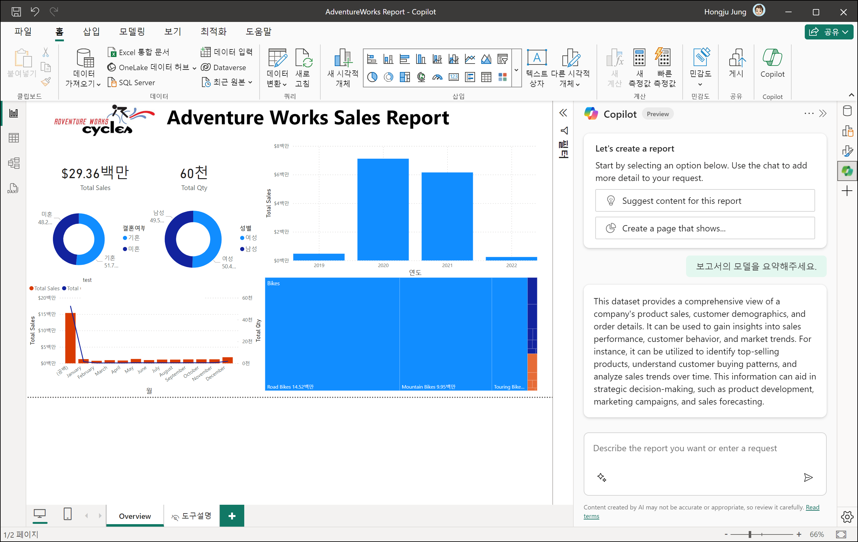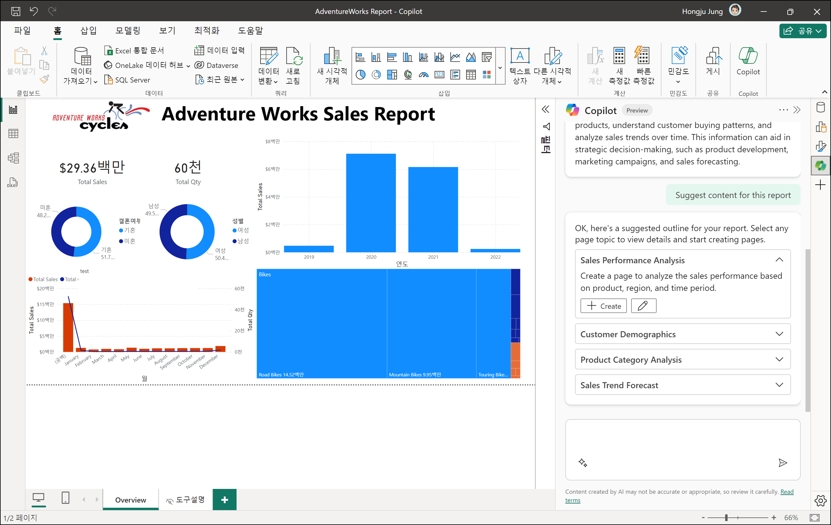 보고서 페이지를 생성하는 등의 Copilot 경험이 Power BI Desktop에서도 제공된다는 것을 간략히 확인해보았습니다.