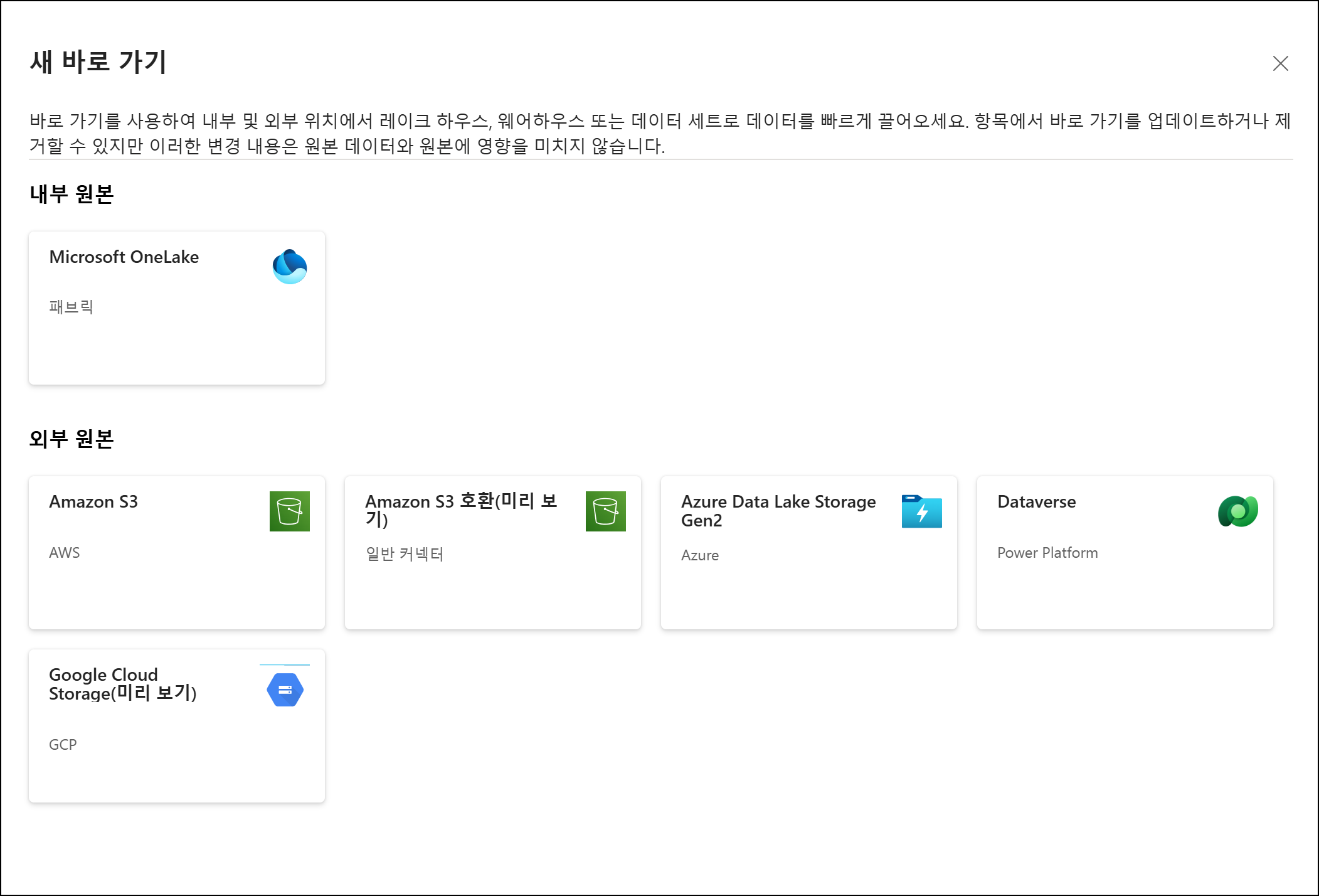 동일 Microsoft OneLake, 다른 클라우드 등 외부 원본의 구성 요소를 바로 가기의 대상으로 추가할 수 있습니다. 동일 Microsoft OneLake에서는 다른 레이크하우스, 웨어하우스, KQL데이터베이스, 미러 데이터베이스를 바로 가기로 통합할 수 있습니다. 외부 원본의 경우 Amazon S3, Google Cloud Stroage, ADLS Gen2, Dataverse 등을 연결할 수 있습니다.