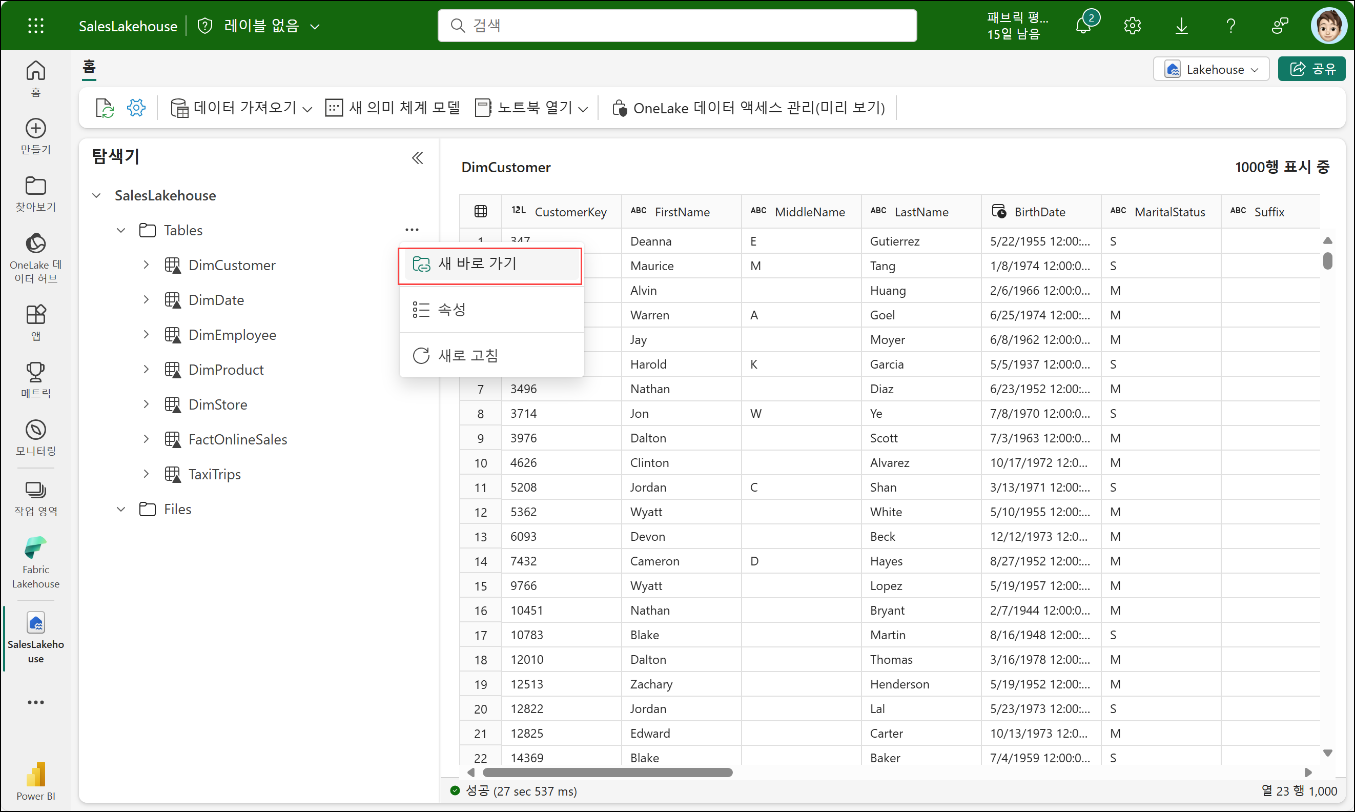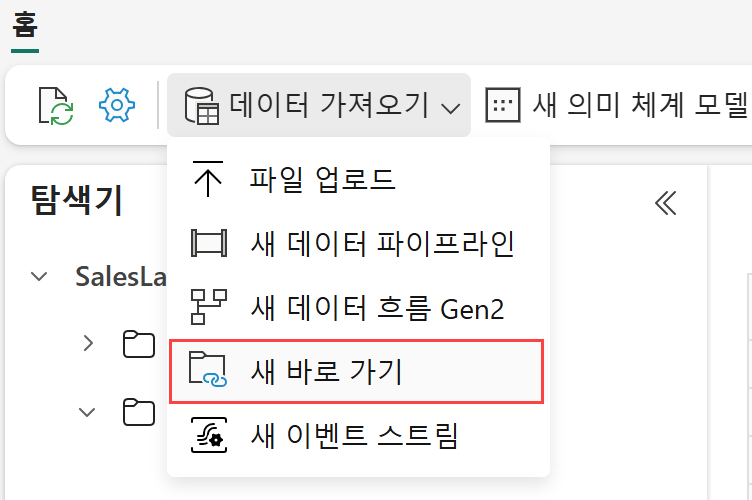 레이크하우스에서 바로 가기를 확인해보겠습니다. [데이터 가져오기]를 클릭하면 바로 가기를 확인할 수 있습니다. 또는 Tables, Files의 … 메뉴를 클릭하면 바로 가기를 확인할 수 있습니다.