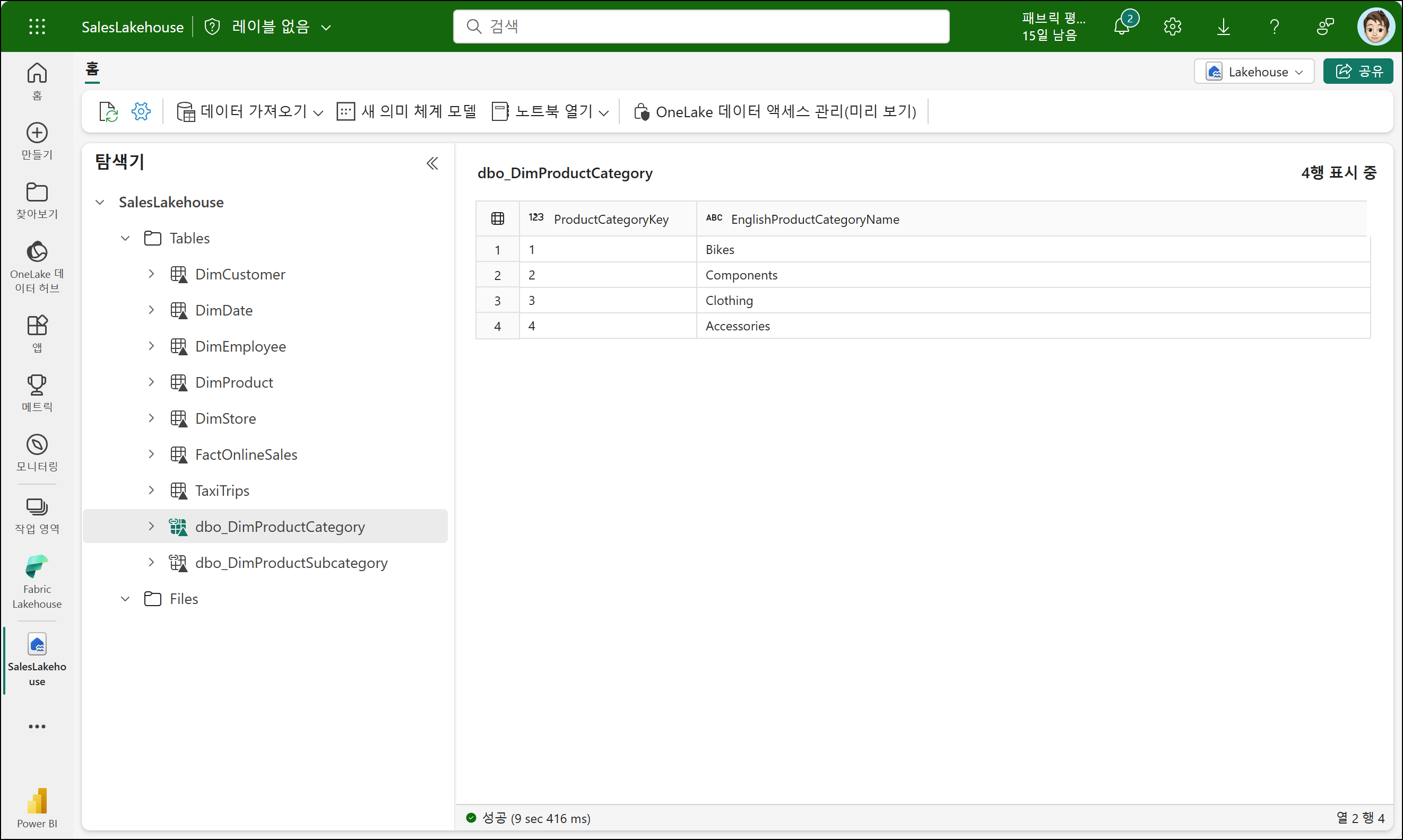 아래 레이크하우스의 테이블을 확인하면 Category, SubCategory 테이블이 존재하지 않습니다. Category 테이블을 생성하기 위해 파일을 업로드하거나 데이터 파이프라인을 생성할 수 있습니다. 그러면 추가 작업을 해야 하고, 데이터 복사본이 만들어지게 됩니다.
