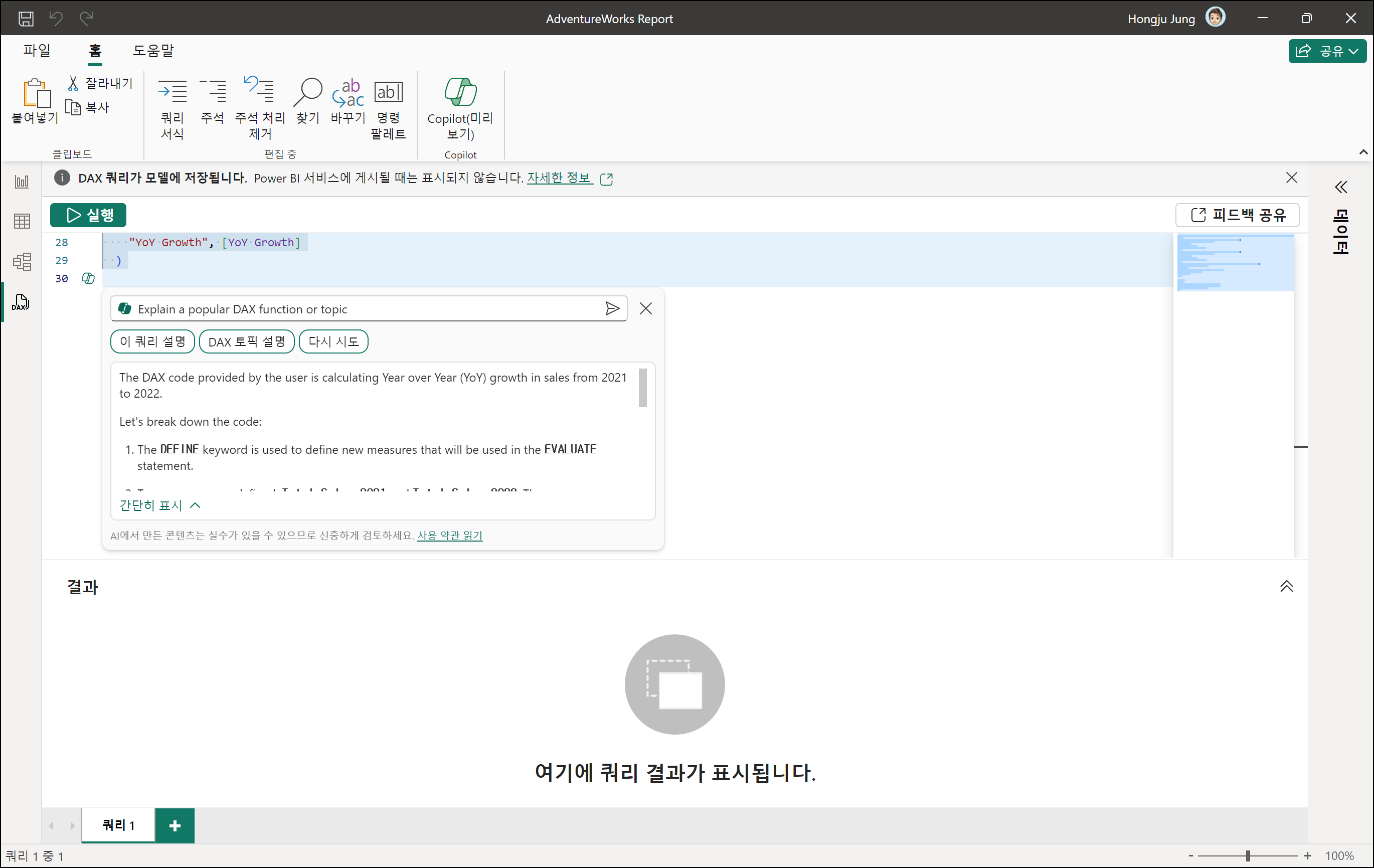 간략히 DAX 쿼리 보기에서 Copilot 업데이트 내용을 확인해보았습니다.