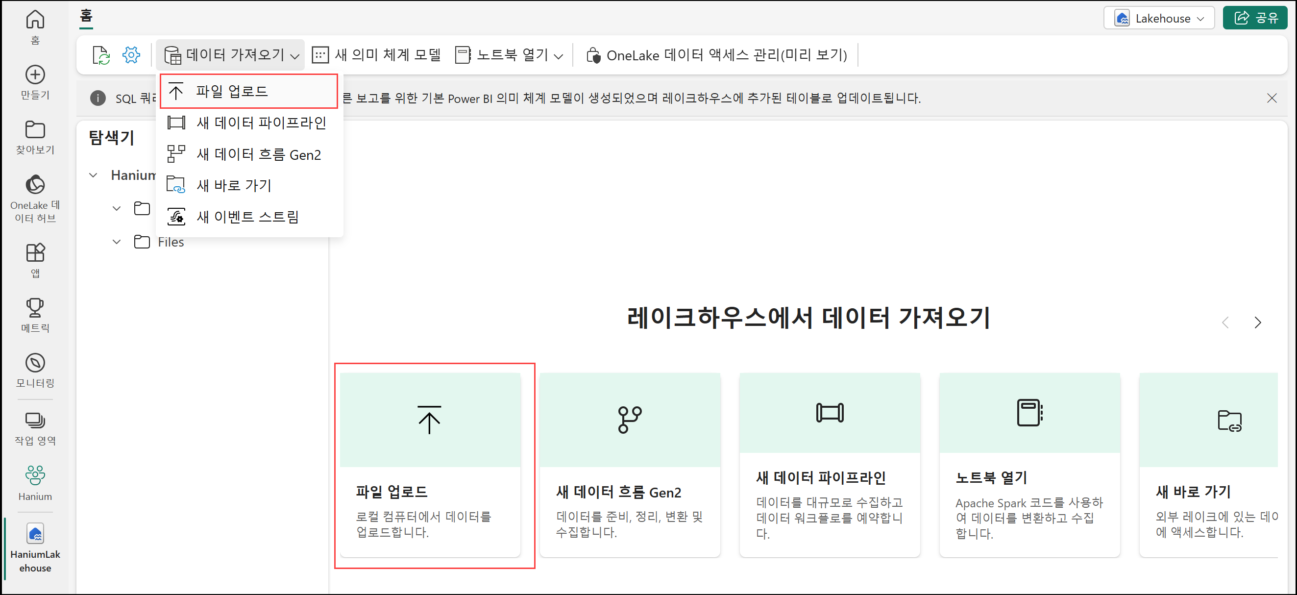 레이크하우스로 이동하여 [파일 업로드] 메뉴를 클릭하면 됩니다.