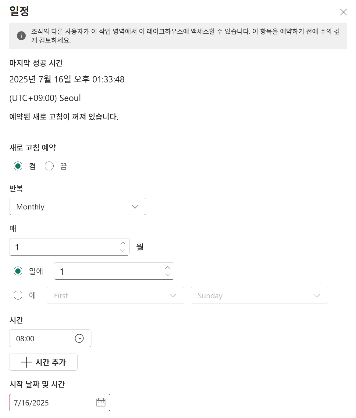 일정을 클릭하게 되면, 구체화된 레이크 뷰에 대한 데이터 새로 고침을 적용할 수 있습니다. 해당 일정이 실행되면, Gold 계층의 데이터가 업데이트되게 되어 데이터 관리가 원활해집니다.