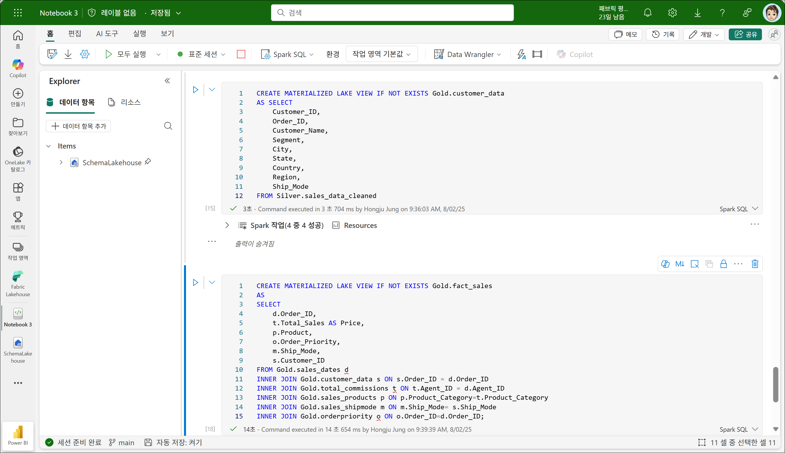 노트북에서는 CREATE MATERIALIZED LAKE VIEW <mlv_name> AS select 구문으로 Silver 계층에 해당하는 뷰를 생성합니다.