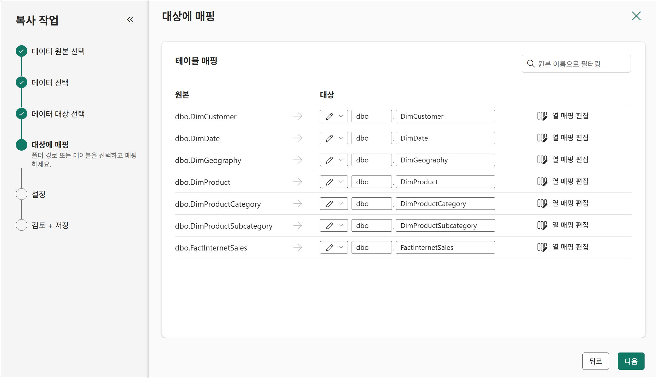 데이터 원본에서 테이블을 선택하여 데이터 대상으로 한꺼번에 데이터를 복사할 수 있습니다.