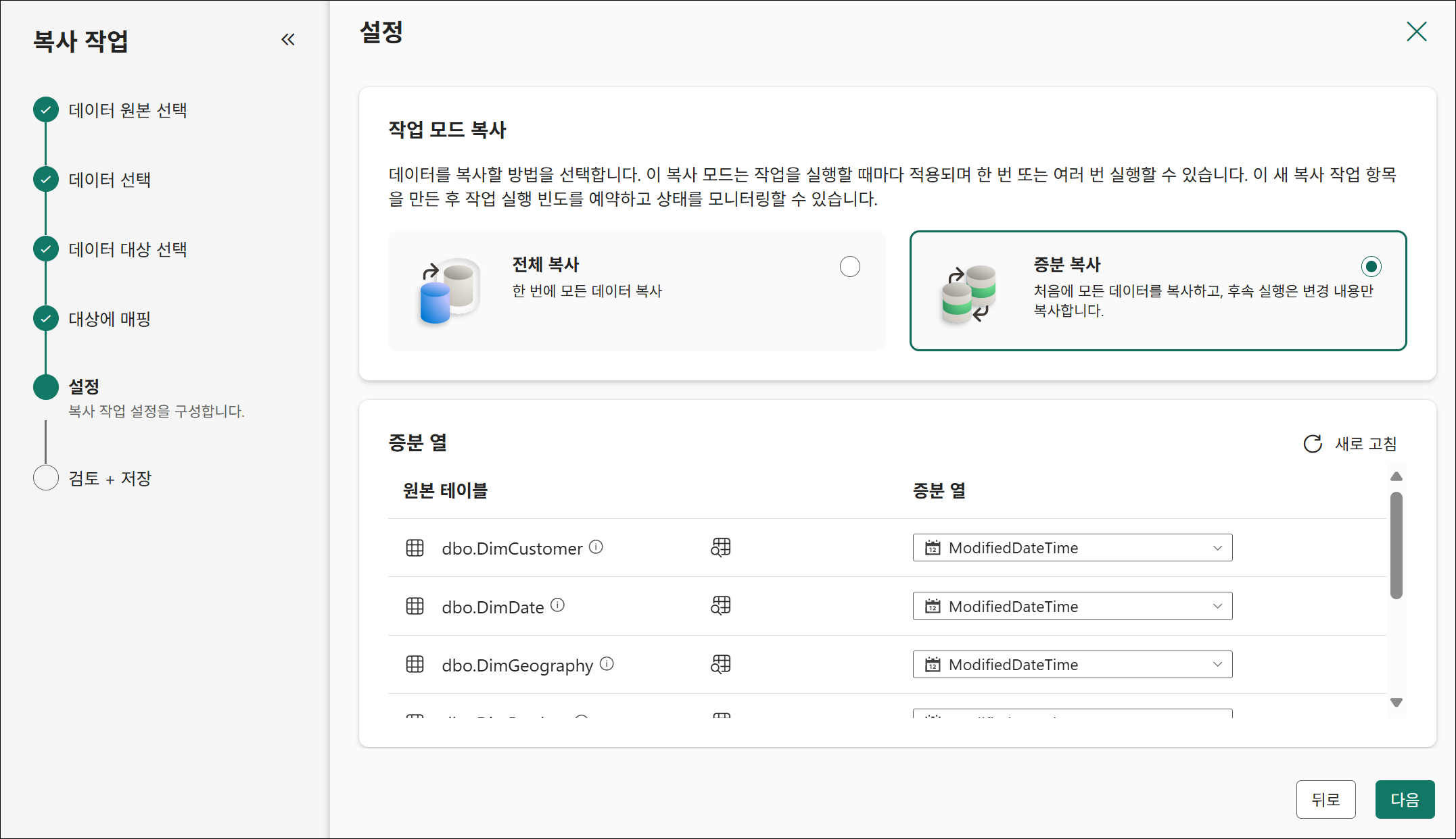 증분 복사를 이용하려면 해당 테이블에 변경날짜와 같은 증분 컬럼이 있어야 합니다.