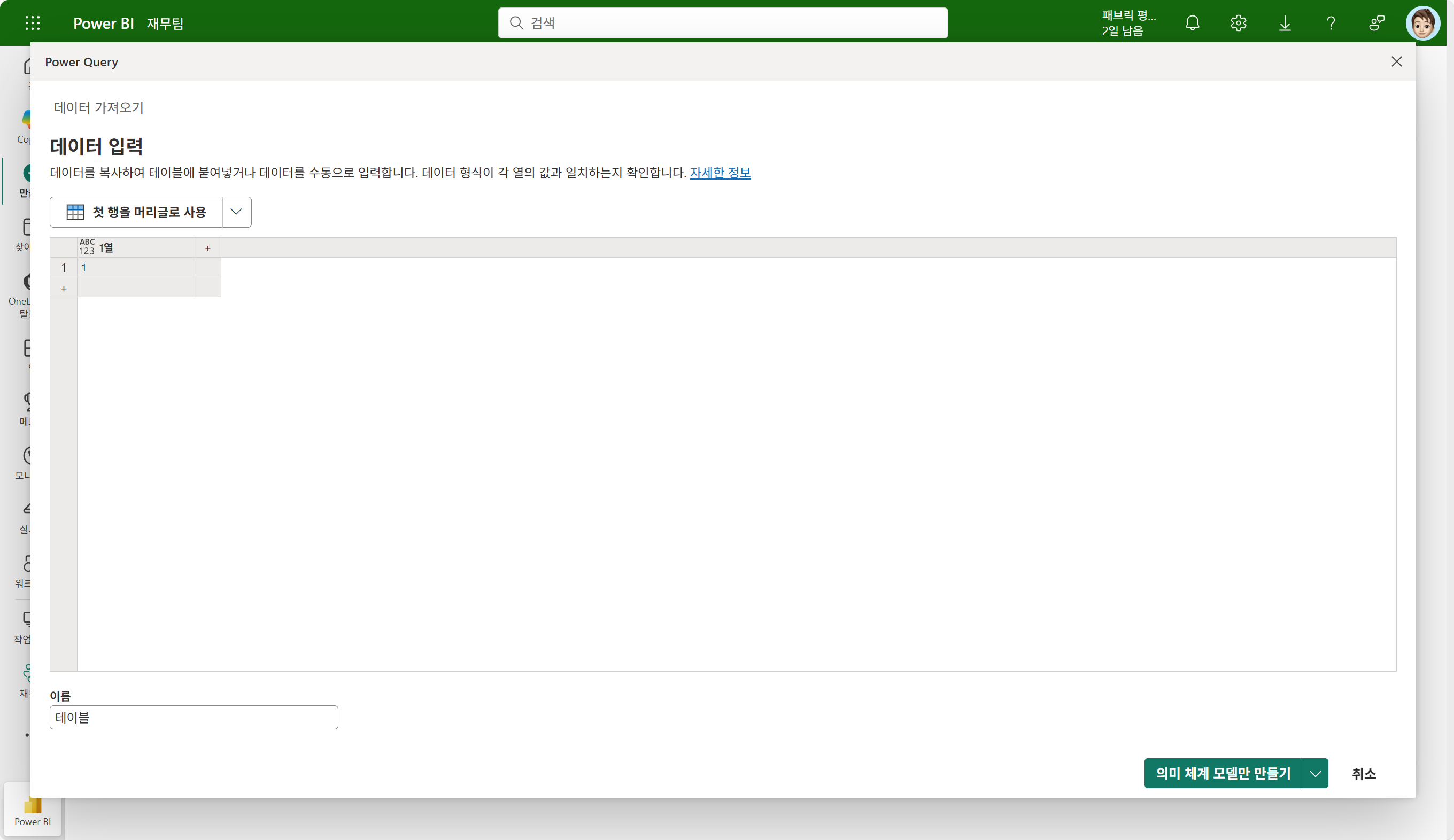 Excel 데이터 파일이 있다면 업로드하면서 진행할 수 있습니다. 데이터베이스를 연결하기 위해 [데이터를 붙여넣거나 수동으로 입력]을 선택하겠습니다. 그리고 임의의 값을 추가하여 [의미 체계 모델만 만들기]를 클릭하여 빈 의미 체계 모델을 생성합니다.
