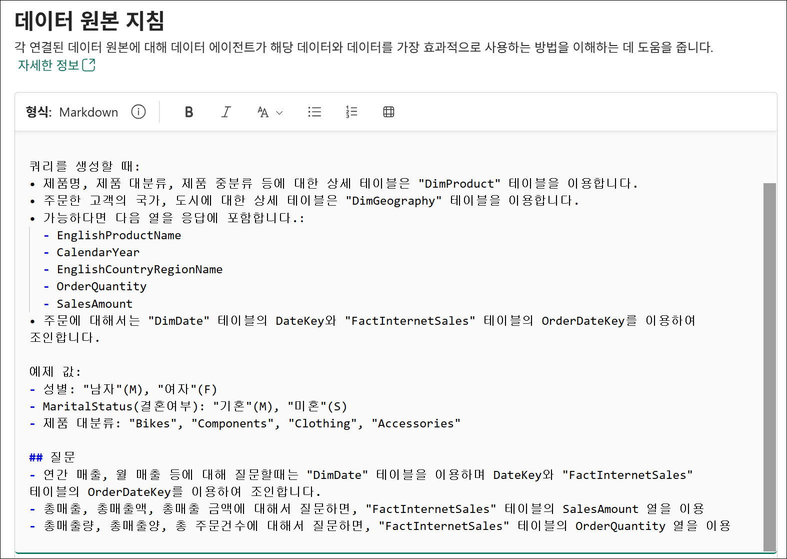 데이터 원본 지침은 관련 테이블, 열, 관계 및 일반 또는 복잡한 질문에 대답하는 데 필요한 쿼리 논리를 제공하게 되면 아래와 같은 사항이 포함될 수 있습니다.