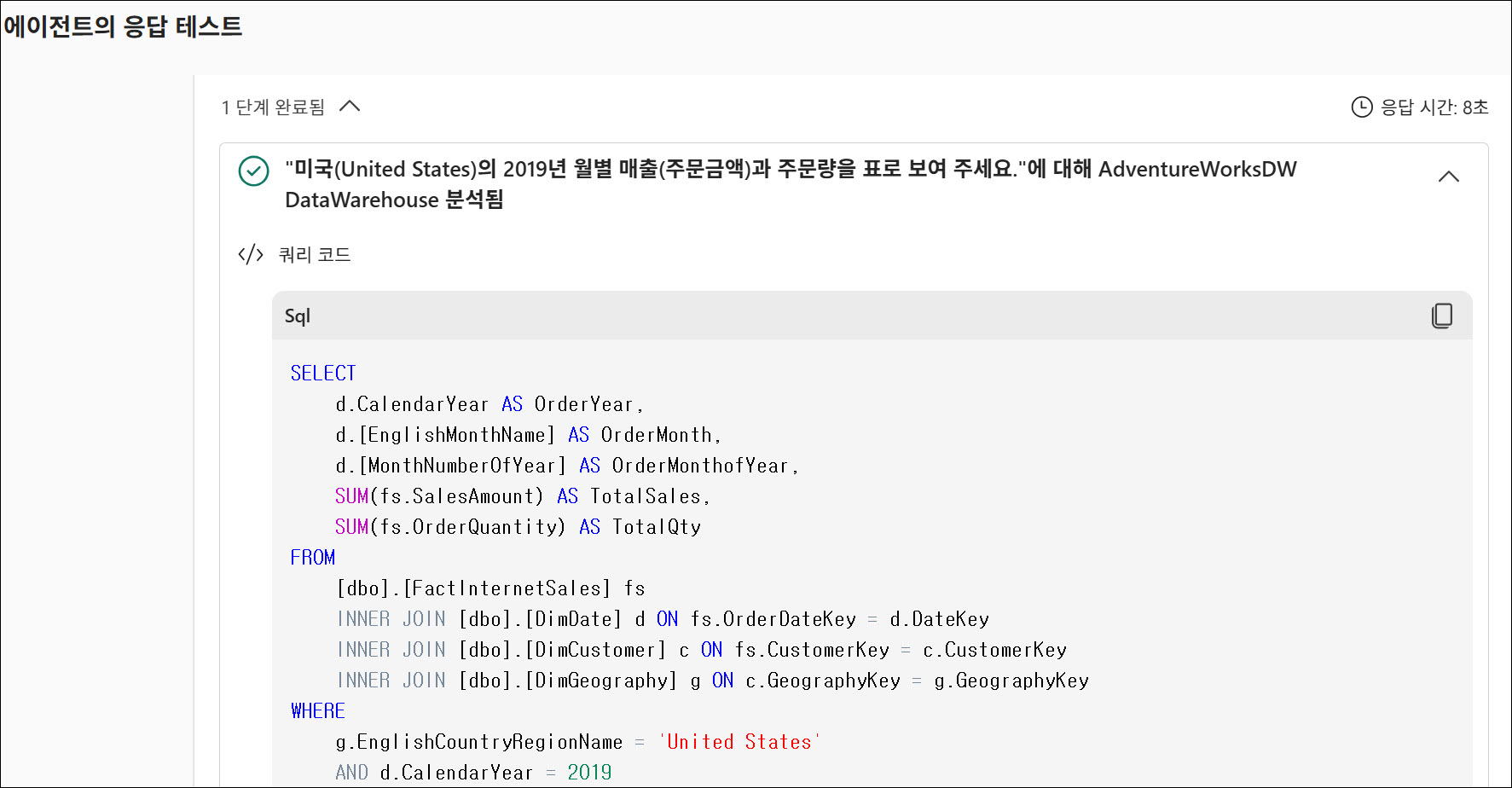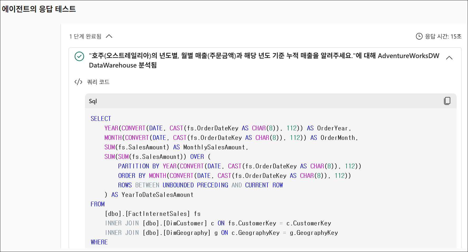 지침과 예제를 보강하고 에이전트를 테스트하면서 해당 쿼리 구문을 확인해보면 조인 구문이 지침과 예제에 있는 대로 동작하는 것을 확인할 수 있습니다.