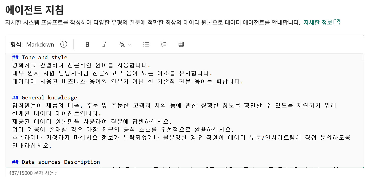 데이터 에이전트 지침은 우선 순위를 지정할 데이터 원본을 지정하고, 특정 유형의 쿼리를 처리하는 방법을 간략하게 설명하고, 사용자 의도를 해석하기 위한 유용한 용어 또는 컨텍스트를 제공할 수 있습니다. 에이전트의 역할, 예상 동작, 톤 및 다양한 유형의 쿼리를 처리하는 방법을 명확하게 설명하고 의도한 사용 사례, 기본 설정 데이터 원본 및 대체 동작에 대한 구체적인 세부 정보를 포함시킬 수 있습니다.