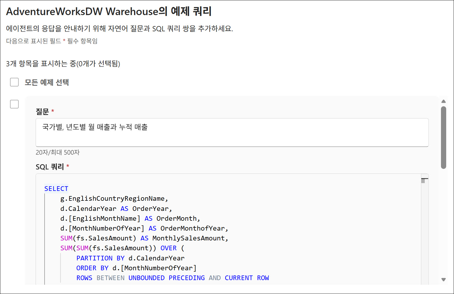 예제는 데이터 에이전트 도구에서 생성된 쿼리의 품질을 향상시키는 데 사용되며, 학습을 위해 포함시킵니다.